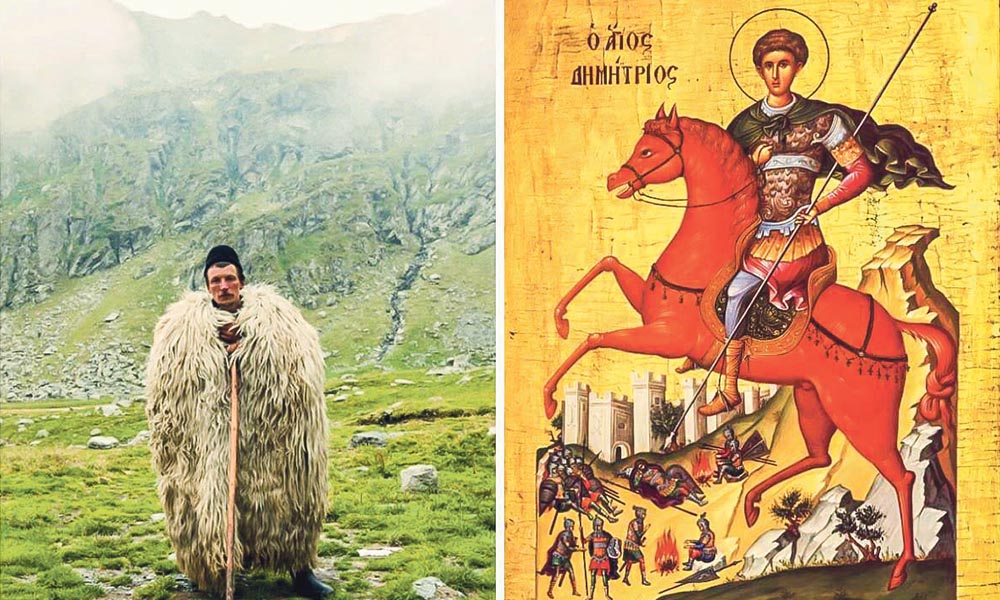 În calendarul popular românesc, Sâmedru (Sfântul Dimitrie Izvorâtorul de Mir) împreună cu Sângeroz (Sfântul Gheorghe) sunt considerați drept sfinți care hotărnicesc domeniul temporal. Aceștia împart anul în două jumătăți, între care granițele sunt marcate de sărbători cu caracter pastoral. În acest sens, vara, patronată de Sângeorz, ține de la 23 aprilie la 26 octombrie. Dacă Sfântul Gheorghe, „cap de primăvară”, mai tânăr și mai năvalnic, are sarcina de a înfrunzi codrul și care și poartă la brâu cheile cu care descuie vara, Sfântul Dumitru are cheile cu care încuie vara și descuie iarna și are misiunea desfrunzirii codrului toamna. Între cei doi este încheiată o învoială pe viață și pe moarte: dacă arborii sunt neînfrunziți pe data de 23 aprilie, Sâmedru îl omoară pe Sângiorz.