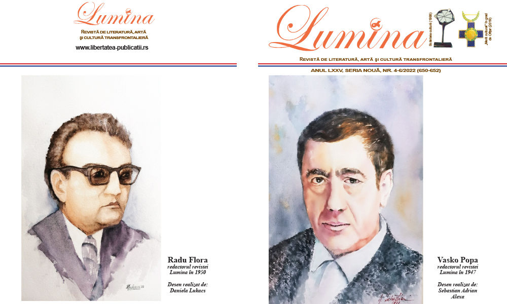 Anul acesta, marcăm 75 de ani de la înfiinţarea revistei ,,Lumina” şi 100 de ani de la naşterea a trei dintre scriitorii care i-au pus bazele: Vasko Popa, Ion Marcoviceanu şi Radu Flora. În acest sens, numărul 4-6/2022, care a apărut în preajma aniversării jubileului ,,Luminii”, este unul cu adevărat aniversar.