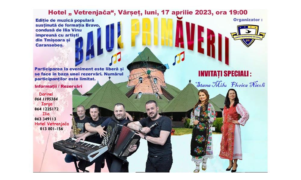 Luni, 17 aprilie 2023, într-o atmosferă feerică a sălii hotelului „Vetrenjača“ din Vârşeț, Asociația Românii Independenți din Serbia (RIS) organizează tradiționala manifestare dedicată anotimpului renașterii și reînvierii – „Balului Primăverii“, ediția a II-a, unde sunt așteptați peste 150 de români în ritmul dansului și al muzicii populare românești. Vom trăi momente unice, alături de virtuozi ai muzicii populare românești din cele două părți ale Banatului (sărbesc și românesc). Primăvara este anotimpul care ne aduce cele mai frumoase sărbători aducând magia reînvierii naturii mai aproape de sufletele noastre.
