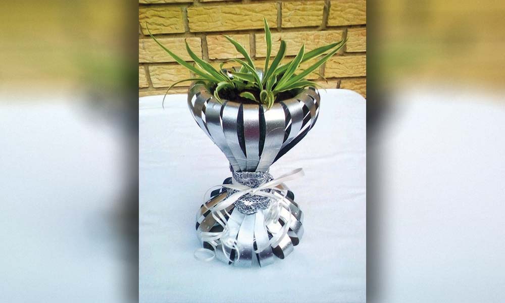 4. În jurul dopului punem silicon fierbinte cu pistolul. Lipim sticlele de plastic cu partea de sus, una de cealaltă. Când sticlele s-au lipit bine, în jurul locului de care am lipit-o, lipim o dantelă acrilică. Mai tăiem o sticlă până la jumătate (acest pas este opțional; eu am făcut ghivece cu a treia sticlă, dar și fără ea). Vopsim totul cu spray acrilic color (am ales culoarea argintie și culoarea cuprului; poza 4).