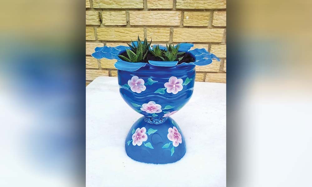 5. Pe ghiveci pictăm flori în tehnica „One stroke painting” și punem capacul pe gușa bidonului la care am făcut mai multe găuri pentru drenarea plantelor. În ghiveci am plantat aloe aristrata, zisă și aristaloe. Este o plantă perenă din familia Asphodelaceae, originară din Africa de Sud. Singura sa specie este aristaloe aristata, cunoscută sub numele de aloe de bibilică sau aloe de dantelă. Aloele sunt plante cu flori extrem de frumoase și ușor de cultivat. Frunza de aloe conține suc de legume, iar planta nu moare după înflorire.