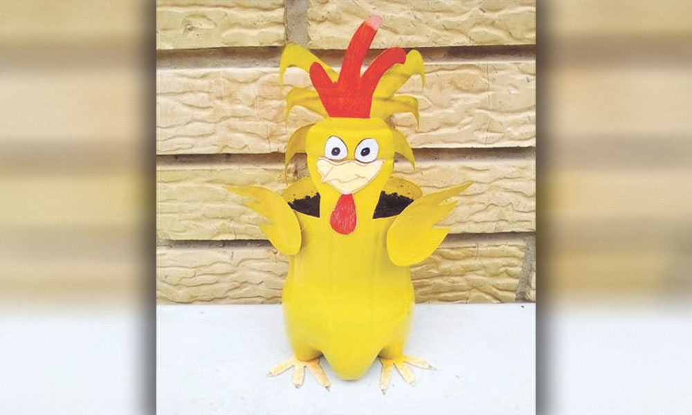 1. Vă prezint un ghiveci foarte neobișnuit în formă de găină galbenă din sticle de plastic. (poza 1)