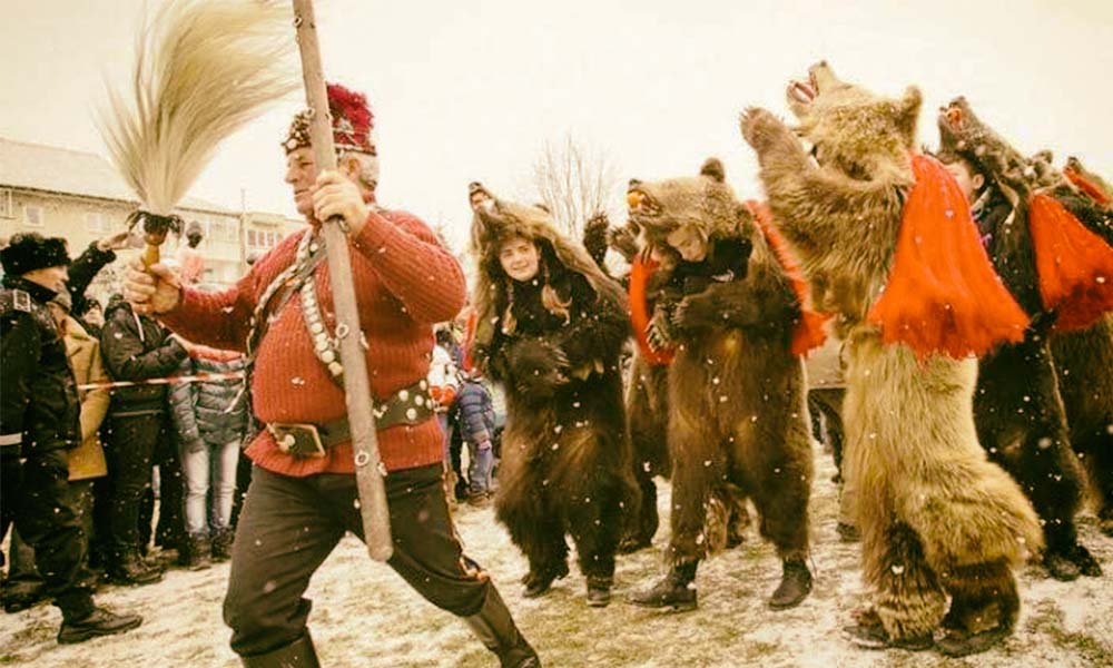 Obiceiul umblatului cu Ursul este întâlnit doar în Moldova, de Anul Nou. Ursul este întruchipat de un flăcău purtând pe cap și umeri blana unui animal, împodobită în dreptul urechilor cu ciucuri roșii. Masca este condusă de un “Ursar“, însoțită de muzicanți și urmată, adesea, de un întreg alai de participanți. În răpăitul tobelor sau pe melodia fluierului, și ajutată de un ciomag, masca mormăie și imită pașii legănați și sacadați ai ursului, izbind puternic pământul cu tălpile. Semnificația este purificarea și fertilizarea solului în noul an.