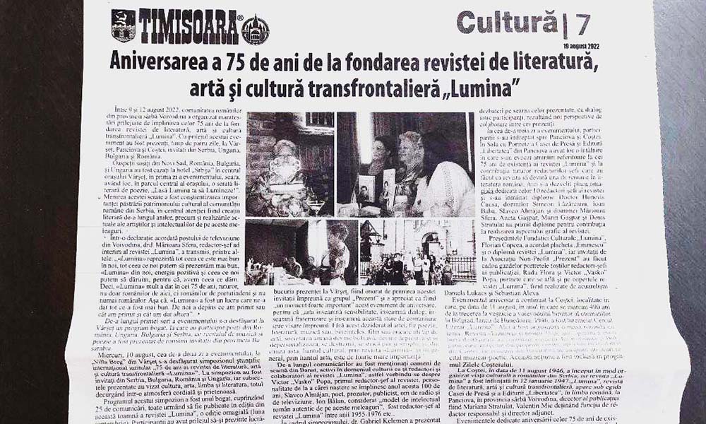 Seria de evenimente prin care s-au sărbătorit cei 75 de ani de apariţie neîntreruptă a revistei ,,Lumina” a avut ecou şi în presa timişoareană. Despre manifestările care s-au desfăşurat în perioada 9-12 august la Vârşeţ, Panciova şi Coştei scrie Cornel Seracin în nr. 31/2022 al ziarului ,,Timişoara”.