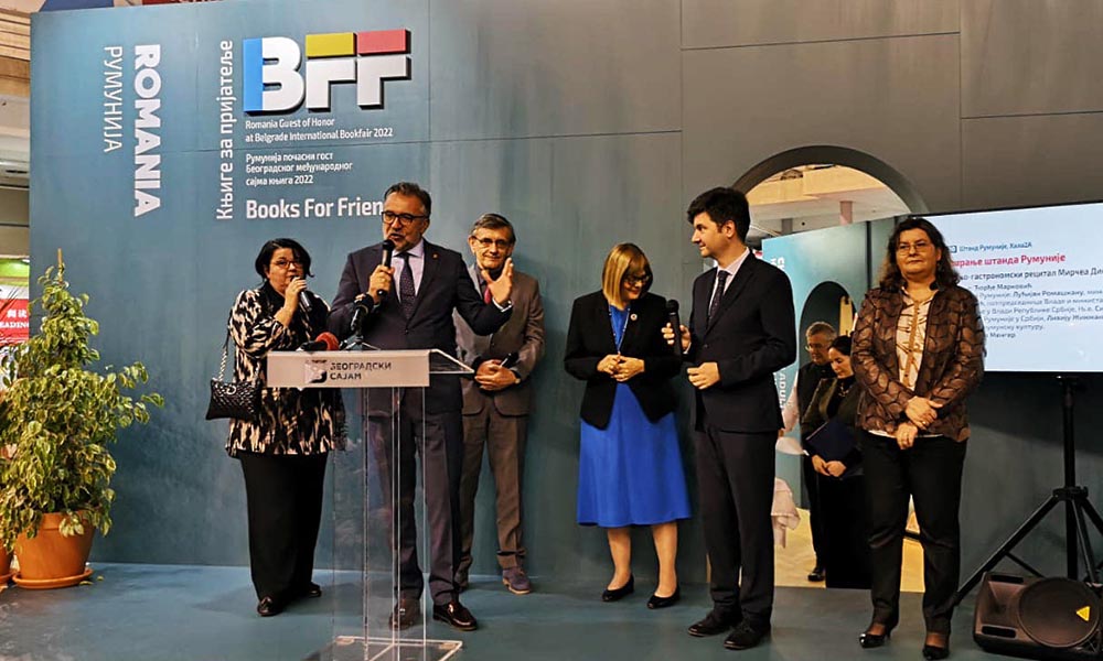 Standul României de la Târgul Internațional de Carte de la Belgrad, l-au deschis oficial, pe 23 octombrie, ministrul culturii din România, Lucian Romașcanu, alături de omologul său din Serbia, Maja Gojković. La acest eveniment festiv au participat Excelența Sa Silvia Davidoiu, ambasador al României în Republica Serbia și Liviu Jicman, președintele Institutului Cultural Român. La deschiderea standului României, publicul s-a bucurat de participarea poetului român Mircea Dinescu. Dânsul a susținut un recital poetico-gastronomic.