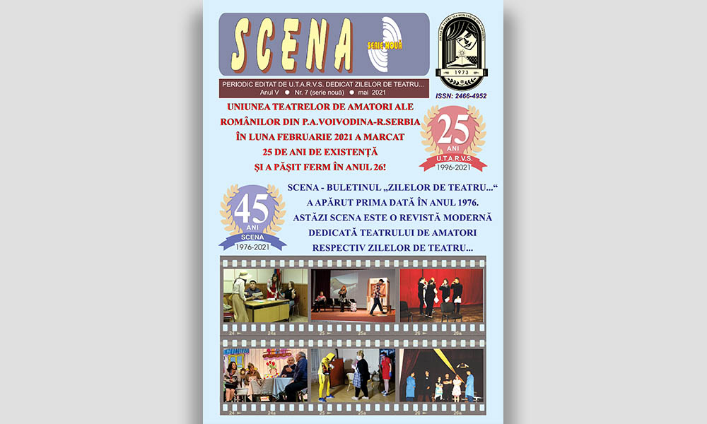 Cel mai nou număr al periodicului ,,Scena”, editat de Uniunea Teatrelor de Amatori a Românilor din Voivodina, R. Serbia, dedicat Zilelor de Teatru, este o ediție jubiliară, anul acesta marcându-se două aniversări importante: 45 de ani de la apariția primului număr al acestui buletin al manifestării teatrale ,,Zilele de Teatru ale Românilor din Voivodina” (1976-2021) și 25 de ani de la fondarea Uniunii Teatrelor de Amatori a Românilor din Voivodina, R. Sebia (U.T.A.R.V.S.).