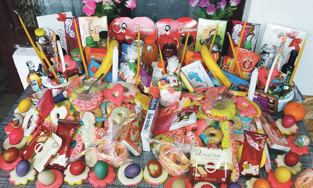 Dimineaţa Paştelui începe cu introducerea în casă a unei bucăţi de sol cu iarbă, numit „pašću sau gliu“. Apoi, fiecare membru al familiei se învârtește pe această bucată de sol cu iarbă. În momentul în care sunt întorşi spre est, unde soarele răsare, mai întâi îşi fac cruce, iar apoi beau o gură de vin din pahar, iau o bucăţică de ou fiert, o frunză de urzică şi un boboc de floare de măr şi spun: „Doamne ajută, ziua de Paște să ne dea sănătate. Să fiu roșu ca oul și sănătos ca urzica, și să ne dea înțelegere, viață bună, sănătate. În pace ne-aflat, în pace să ne lasă”. În unele locuri, după rostirea acestor cuvinte, se sare cât mai departe de solul cu iarbă. Toate cele ce se iau în dimineaţa Paştelui, vinul, oul, urzica şi bobocul de floare de măr, sunt un simbol al sănătăţii. Există şi unele abateri de la tradiţie, aşadar în unele locuri în paharul cu vin se pun trei frunze de urzică şi de corn, ou tăiat, iar bobocul de floare rămâne acelaşi. După a treia zi, bucata de sol pe care se găseşte coaja ouălor mâncate, se scoate din casă şi se întoarce la locul de unde a fost luată. Altfel, în ziua Paştelui se trezeşte de dimineaţa, se hrănesc vitele, şi după mai multe săptămâni de post, se pregăteşte micul dejun bogat cu multă grăsime. În ziua respectivă se pregăteşte pâinea de post, colacul de Paşti, care împreună cu restul hranei pregătită este menit pentru ziua de Paşti, pentru Dumnezeu, şi pentru sănătatea şi bucuria copiilor, a familiei, vitelor şi a ţării natale. Colacul de Paşti are în această zi o decoraţiune specială din ouă de diverse culori, printre care unul rămâne necoloarat, iar patru sunt multicolore. Colacul de Paşti rămâne pe masă în cele trei zile în care se sărbătoreşte Paştele.