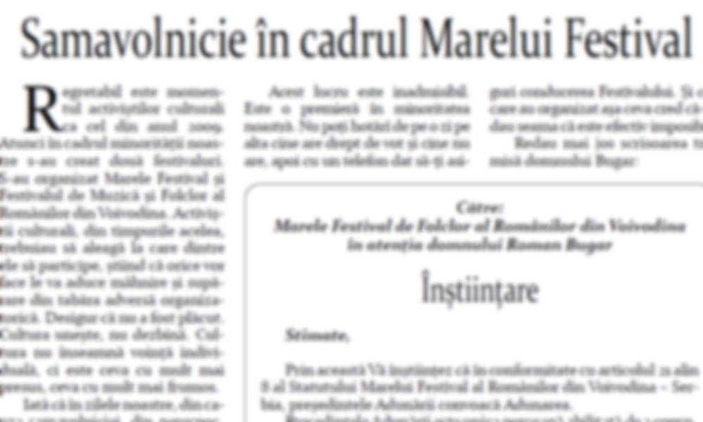 Prin această Vă înștiințez că în conformitate cu articolul 21 alin 8 al Statutului Marelui Festival al Românilor din Voivodina – Serbia, președintele Adunării convoacă Adunarea.