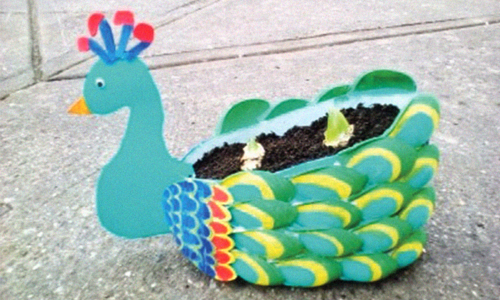 1. Vă prezint încă o reciclare creativă dintr-un recipient de la balsamul de rufe cu lingurițe de plastic, din care va rezulta un ghiveci în formă de păun. (poza 1)