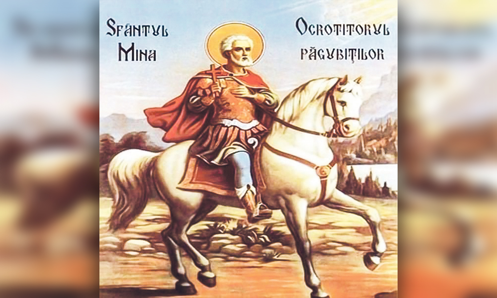 Sfântul Mucenic Mina a fost egiptean ca neam dar creştin din punct de vedere al credinţei, și de meserie ostaş în armata romană sub stăpânirea tribunului Fermilian în Mitropolia Cotuanului. Motiv pentru care a sfârșit prin a fi martirizat, după ce a refuzat să-și renege credința creștină. În acele vremuri erau la conducere împărații păgâni Diocleţian şi Maximian, care dăduseră poruncă pe tot teritoriul Imperiului Roman să fie supuși la munci silnice, omorâţi și dați ca jertfe la idoli toţi credincioşii creștini de pretutindeni care nu se vor închina idolilor lor.