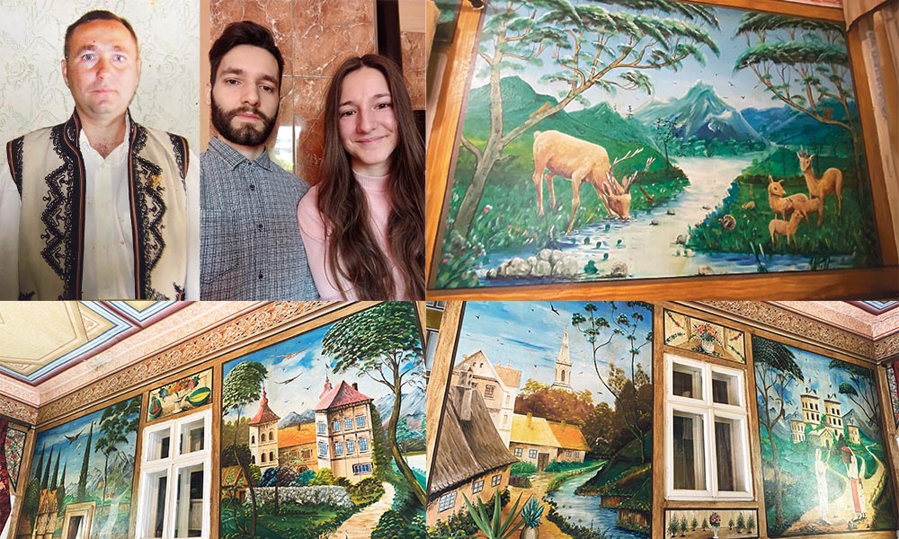 La intrarea în casă, privirea se îndreaptă spre imensele picturi realizate pe pereți. Nici nu ai timp să privești îndeajuns o pictură, căci observi dintr-un alt colț încă una, și tot așa… Nu poți alege care dintre ele este mai frumoasă, căci fiecare are o splendoare aparte. Bogdan ne dezvăluie că pereții au fost pictați în anul 1982. Însă, dacă ne-am ghida după strălucirea lor, n-am crede că picturile îi împodobesc pereţii casei de mai bine de 40 de ani.