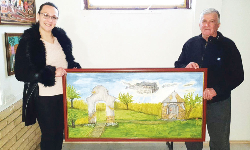 ,,La 73 de ani am început să pictez, mai întâi cu creionul și apoi cu tempera. Pictez obiceiuri de la sărbători și alte momente din viața Uzdinului. Am decis donez Căminului Cultural ,,Doina” din Uzdin o pictură foarte dragă mie: ,,Izvorul lecuitor și Poarta speranței”. Nu departe de Uzdin se află un izvor a cărui apă lecutioare au folosit-o uzdinenii. Această apă ajuta la tratarea bolilor de piele, dar mai ales era utilă la spălatul ochilor. Acest izvor ar fi fost descoperit de un cetățean străin care în urma războaielor ar fi rămas la Uzdin. Povestea spune că acest bărbat ar fi visat că leacul pentru ochi ar fi apa izvorului ce trebuia săpat chiar în locul unde se găsește și azi fântâna. După un timp bolnavul s-a făcut bine. În semn de amintire, în același loc a făcut o fântână zidită cu piatră și o încăpere din cărămidă, acoperind fântâna cu o cupolă. Construcția se termină cu o cruce din fier.