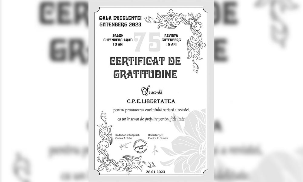 Galaxia „Gutenberg” Arad s-a aflat în ceremonial (Tipografia Gutenberg la 75 de ani, Revista Gutenberg la 15 ani, Salon de presă culturală – 10 ani), prilejuit de Gala Excelenței, ediția a V-a (pentru celebrarea tipăriturilor din anul 2022).