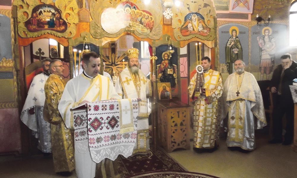 La sosirea PS Părinte Ieronim, Episcop al Daciei Felix, a fost întâmpinat în fața Bisericii Ortodoxe Române din loc, de preoți și un grup de copii îmbrăcați în portul popular, care i-au dăruit tradiționala pâine și sare, precum și un buchet de flori. În curtea sfântului lăcaș, vestita Fanfară „Turturica” din sat a interpretat câteva melodii românești. Programul liturgic a început de la ora 9.30 cu celebrarea Sfintei Liturghii. Slujba a fost săvărșită de Părintele Arhimandrit Longhin Muncean, Protopop Doru Ovidiu Ursu, Pr. Iconom Stavrofor Cornel Juică, Pr. Cristian Băbuț și diaconi în frunte cu PS Părinte Ieronim.